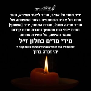 יו״ר מחוז תל אביב, עו״ד ליאור שפירא, וועד מחוז תל אביב משתתפים בצער משפחתה של עו״ד תרצה שובל, חברת המחוז, יו״ר (משותף) ועדת ייפוי כוח מתמשך הארצית וחברת וועדת קידום מעמד האישה, על פטירת אחותה מירי מרים כחלון ז״ל.