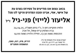 יו״ר מחוז תל אביב, עו״ד ליאור שפירא, וועד המחוז משתתפים בצערה של משפחת פני-גיל עם פטירתו בטרם עת של חברנו, עו״ד אליעזר פני-גיל, חבר המחוז, שכיהן כיו״ר ועדת שכ״ט בלשכה הארצית.