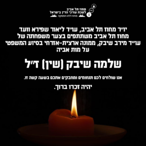 יו״ר מחוז תל אביב, עו״ד ליאור שפירא, וועד מחוז תל אביב משתתפים בצער משפחתה של עו״ד מירב שיבק, ממונה ארצית-אזרחית בסיוע המשפטי, על מות אביה שלמה שיבק (שין) ז״ל