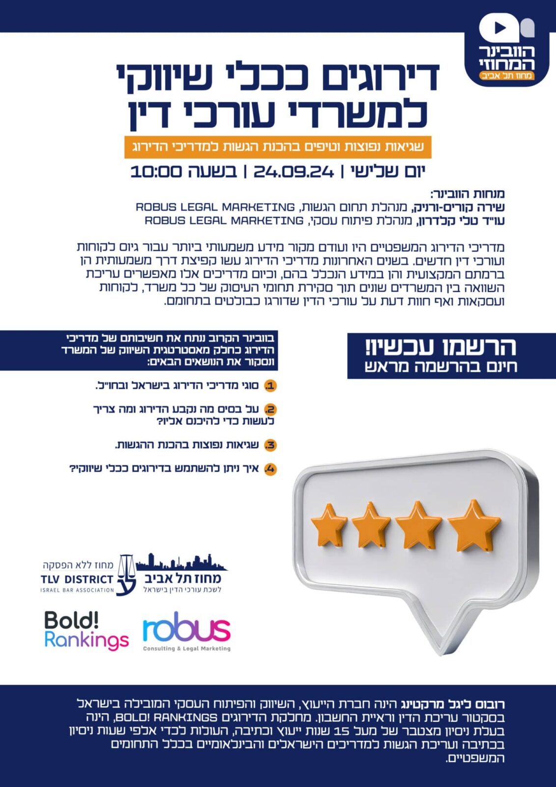 בוובינר הקרוב ננתח את חשיבותם של מדריכי הדירוג כחלק מאסטרטגית השיווק של המשרד ונסקור את הנושאים הבאים:
