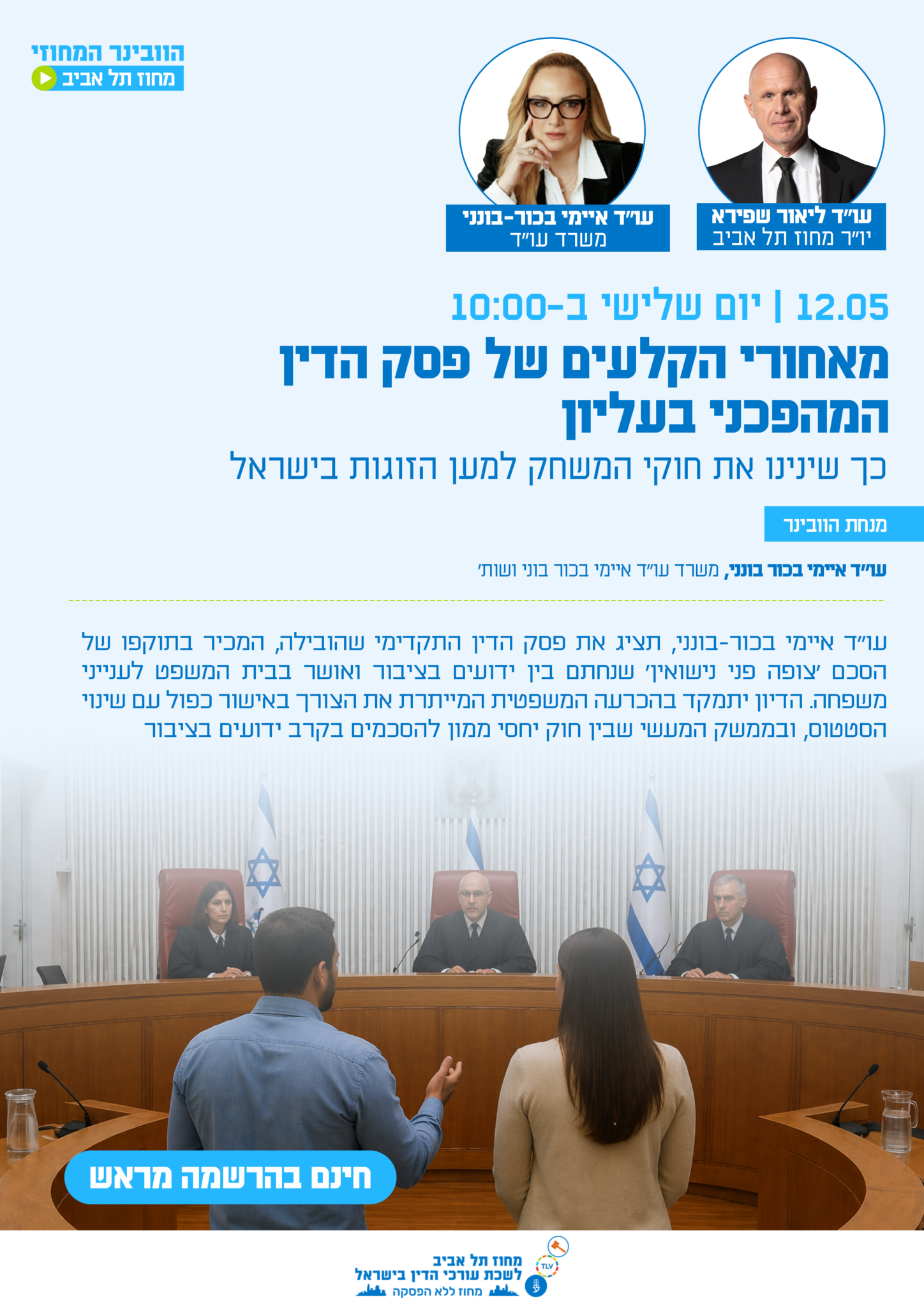 עו"ד איימי בכור-בונני, תציג את פסק הדין התקדימי שהובילה, המכיר בתוקפו של הסכם 'צופה פני נישואין' שנחתם בין ידועים בציבור ואושר בבית המשפט לענייני משפחה. הדיון יתמקד בהכרעה המשפטית המייתרת את הצורך באישור כפול עם שינוי הסטטוס, ובממשק המעשי שבין חוק יחסי ממון להסכמים בקרב ידועים בציבור