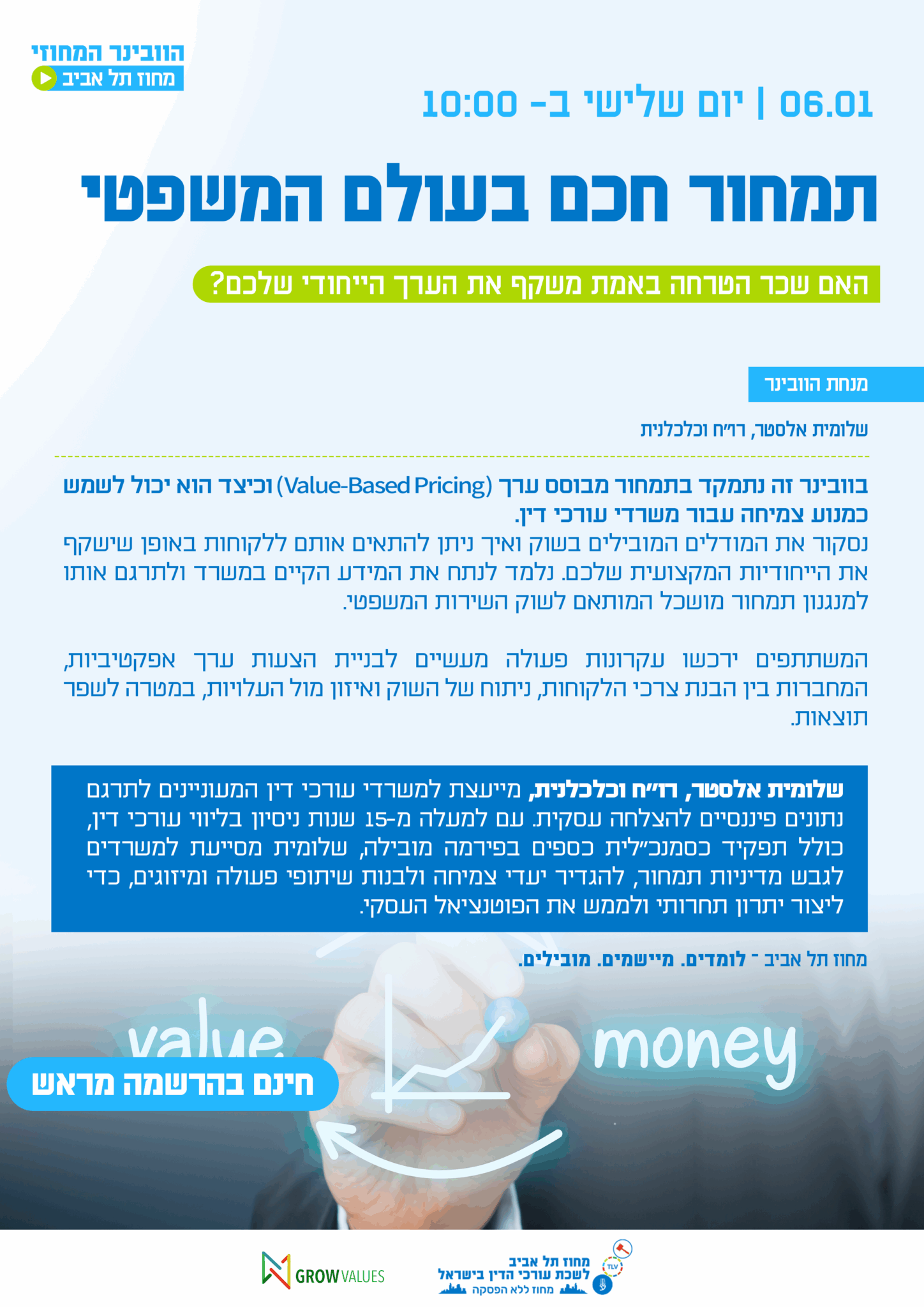 בוובינר זה נתמקד בתמחור מבוסס ערך (Value-Based Pricing) וכיצד הוא יכול לשמש כמנוע צמיחה עבור משרדי עורכי דין. נסקור את המודלים המובילים בשוק ואיך ניתן להתאים אותם ללקוחות באופן שישקף את הייחודיות המקצועית שלכם. נלמד לנתח את המידע הקיים במשרד ולתרגם אותו למנגנון תמחור מושכל המותאם לשוק השירות המשפטי. המשתתפים ירכשו עקרונות פעולה מעשיים לבניית הצעות ערך אפקטיביות, המחברות בין הבנת צרכי הלקוחות, ניתוח של השוק ואיזון מול העלויות, במטרה לשפר תוצאות.