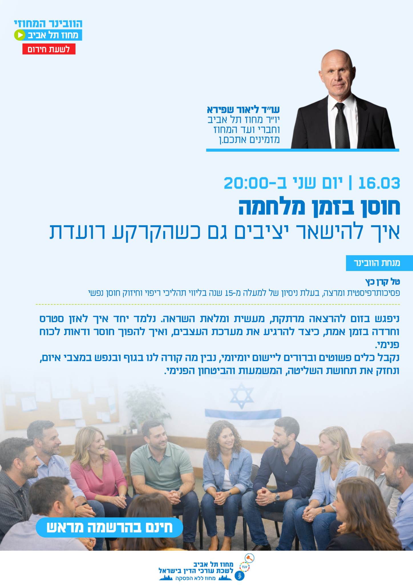 נקבל כלים פשוטים וברורים ליישום יומיומי, נבין מה קורה לנו בגוף ובנפש במצבי איום, ונחזק את תחושת השליטה, המשמעות והביטחון הפנימי.